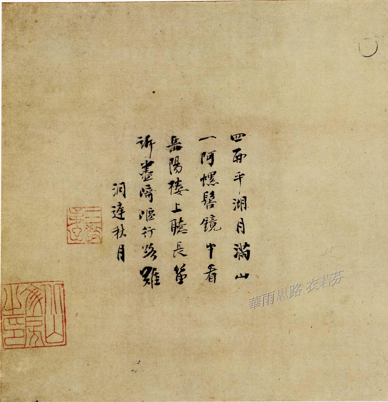 The vermillion inked square seal which reads “Sanjiao Dizi”(三教弟子, Three Religions Disciple) can be found on each of Yu Jian’s Eight Views of Xiao-Xiang. Among the Eight Views, the painting Fall Moon on Dongting Lake, not only has a “Sanjiao Dizi” seal, but also a seal which reads “Beishan Wenfang Zhi Yin”(北山文房之印, Northern Mountain Library Seal) .